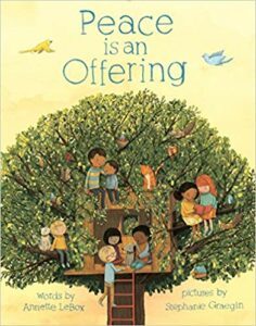 Peace is an Offering by Annette LeBoxThis book teaches children how everyday actions can sow seeds of peace in their neighborhood. Peace is an Offering connects the everyday to the holy, inviting readers to make connections to small deeds to holy action. The illustrations in this book are sweet and joyful and we love talking about being people who value peacemaking as part of what our faith teaches us.