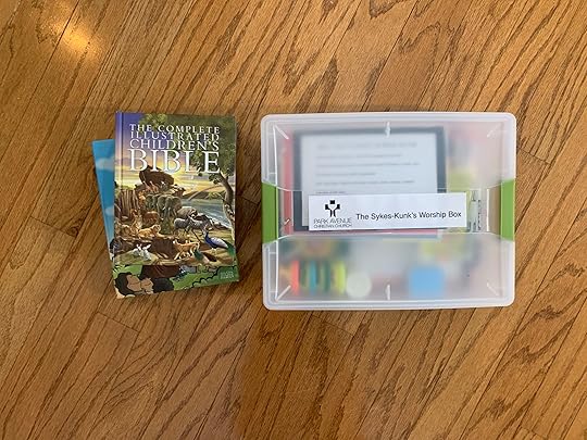 Each family received a box with their name on it. Families with multiple siblings got duplicate supplies such as the white board, play doh and wicky stix. I chose a box that was large enough that families could also place their Spark House Children’s Bible or other Bible in the box with the materials. We treat the boxes as sacred, which means we leave all the materials in them so we can use them to encounter God’s good word for us each week.