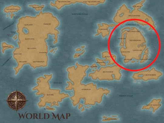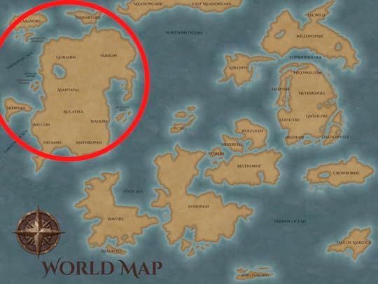 This week, I’ll talk about The Archives of the Ancient Kingdoms franchise which is an adult epic fantasy series. So far, the published books are Eiagan’s Winter, The Revenant Queen, and the soon to be released The Eternal Queen. All three take place in Goranin, one of the ancient kingdoms on the map below. The red circle denotes the area where this series takes place. I plan to write additional novels set in the surrounding kingdoms, but the first three are in Goranin.