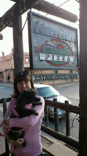 The location is lovely, with a long portal fronting Old Santa Fe Trail where there is great people (and dog) watching, in a portion of "the oldest home in America" (built in the 17th/18th century), with twisty little adobe rooms. Live music and fun employees make it even better. (and it's very dog friendly). Abby especially recommends the great lunch specials (3.99 for a slice, drink, and salad??!!)