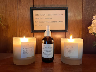 I got two scents: Geranium + Rose and Moonglow. The former does just what it says on the tin. It's bright and floral, and a fairly straightforward scent. The rose is more of an undertone, so if you're like me and are just a fiend of all things rose, you might not be getting exactly what you're expecting. That said, it is quite nice. I like this one for daytime, when I want a scent that's a bit more energetic.
