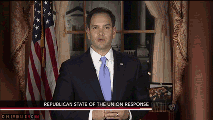 Where did this kid come from? I mean, who thought it was a bright idea to have junior Marco deliver the response to President Obama’s State of the Union address? The speech was a by-the-numbers right wing attack speech that could have been written back during the days of Milli Vanilli. Nothing about voter suppression. Why did he vote against the Violence Against Women Act on this very day? It’s not even controversial. No wonder he’s got dry mouth.