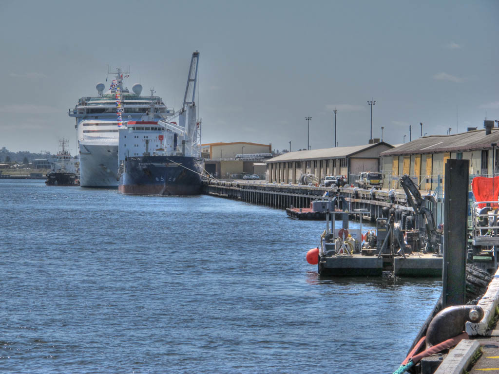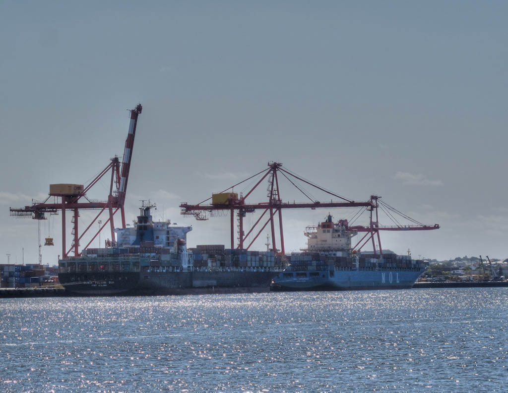 In this image you can see two slightly smaller Malaysian container ships offloading cargo. Even a small port like this can move a great deal of traffic with container handling and ship-to-rail and ship-to-truck facilities.