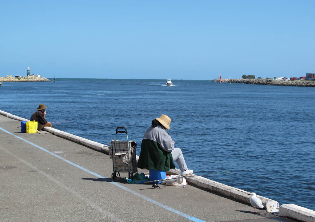 As the container crews work fisherman gaze out to sea and wait for the big one to bite.