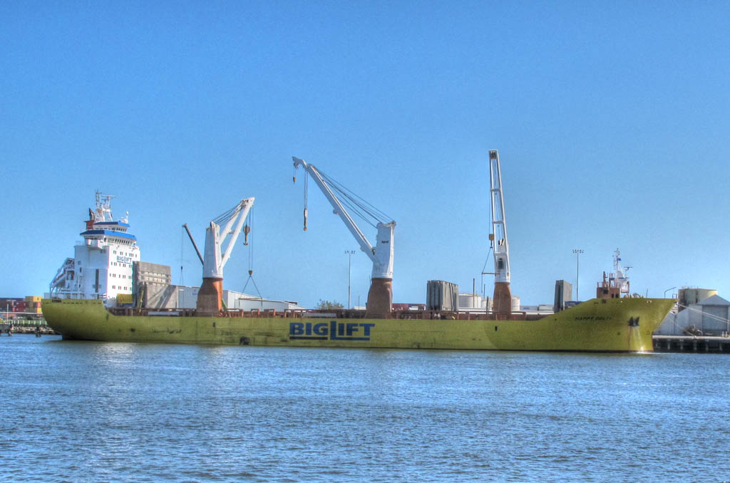 It's much easier to visit the ports here than in America. Here's a BigLift's heavy lift ship heavy lift ship Happy Delta tied up at the container terminal. She is brand new, as of January 2011, and can lift 800 tons between the two deck cranes. Standard container ships, in comparison, are limited at cargos of about 40 tons per container.