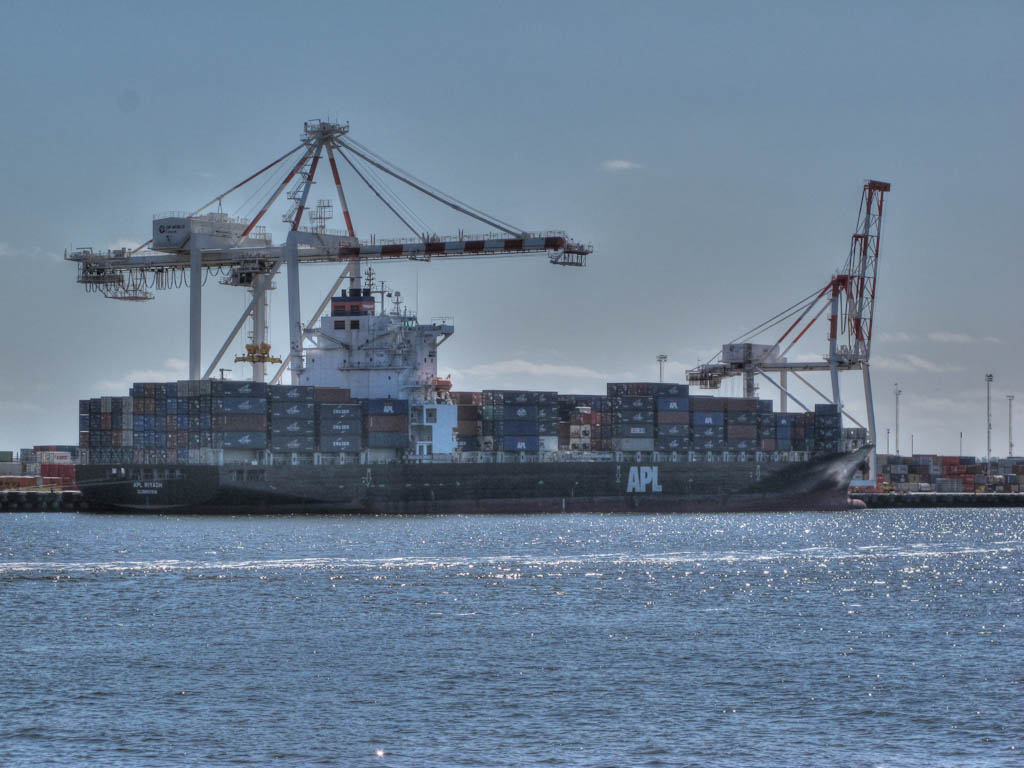 In this image you see APL RIYADH, an 850-foot container ship operated by American President Lines. She's also a new ship, built in 2010 with the capacity to carry some 4,300 shipping containers. She's powered by a single MAN diesel engine developing 50,000 horsepower. That's equivalent to a dozen heavy freight locomotives, but she carries vastly more cargo than those same locomotives could pull. That's why ocean transport is so efficient, and so inexpensive for the tons and miles moved.