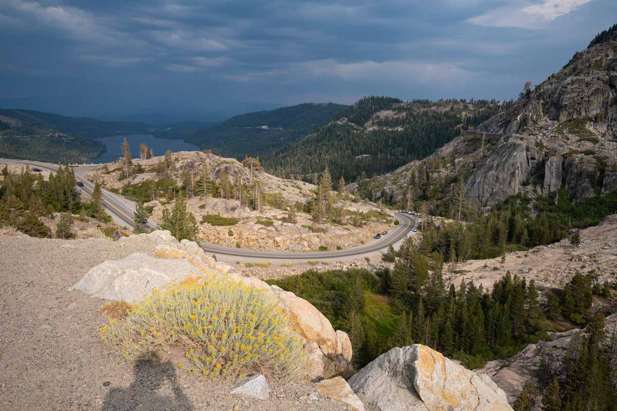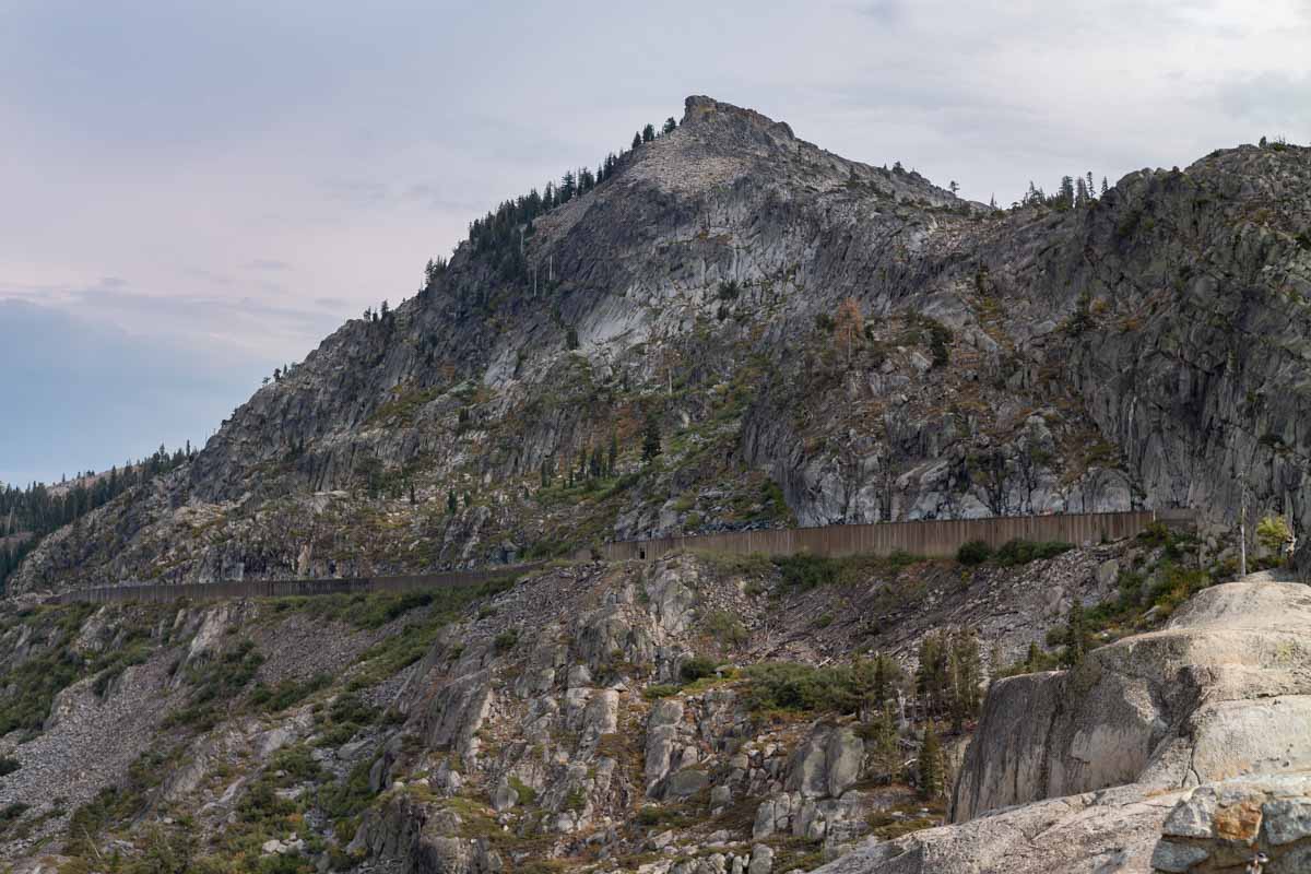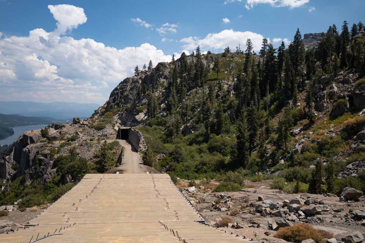 Donner Lake seen from the pass. The Central Pacific (now UP) rail line clings to the slope on the rightOver the next 20 years thousands of settlers used Donner Pass to reach the promised lands of California. The granite was rough and unforgiving, forcing settlers to dismantle their wagons and haul them over rocks, with many losing their belongings and even limbs or lives in the process.When talk of a transcontinental rail link materialized, the route was surveyed through Donner Pass. Trains need a constant gentle slope, without up and down, so the route they chose was a bit south of the footpath and wagon road. The two paths do remain in sight of each other across the pass. The trail goes up and down over terrain to follow the most direct route. The rail line is cut at a constant angle into the sides of the mountains, clinging to them like a pasted-on stripe.