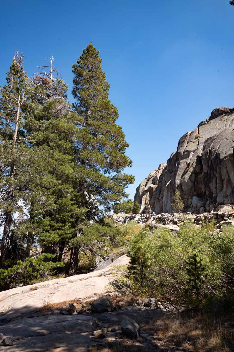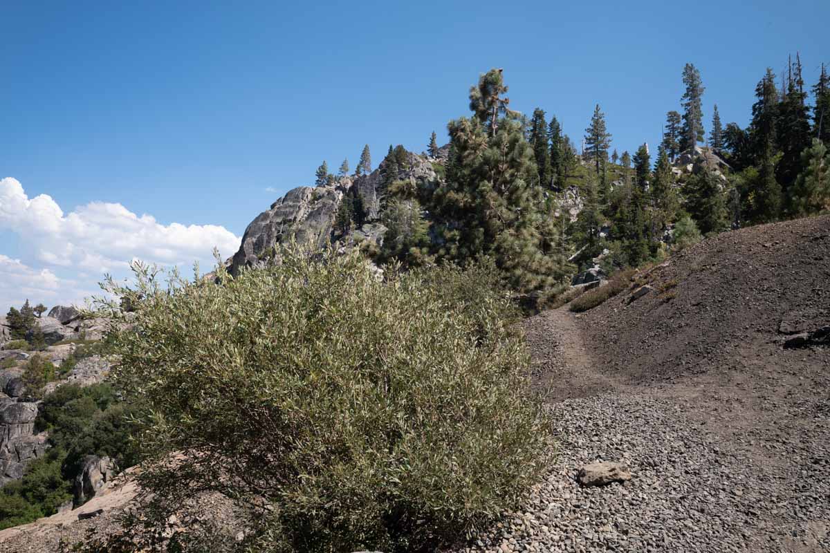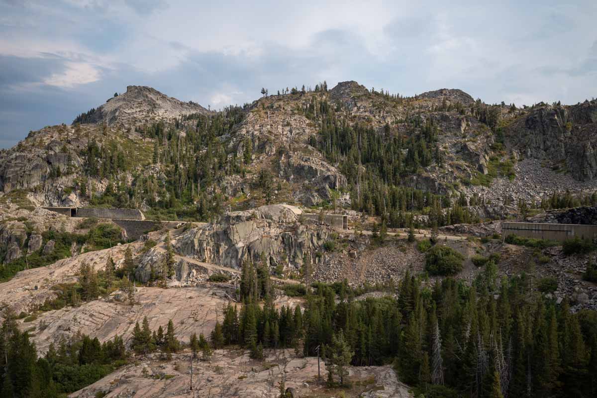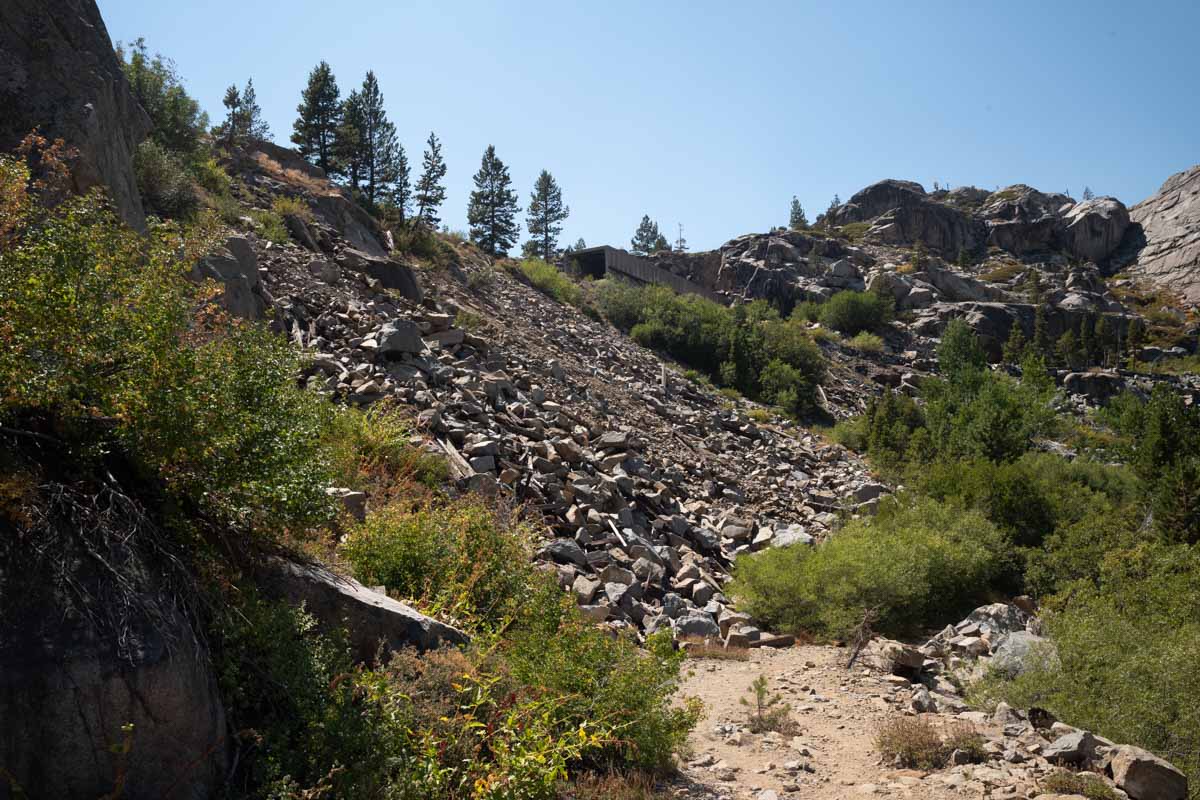 Donner Lake seen from the pass. The Central Pacific (now UP) rail line clings to the slope on the rightOver the next 20 years thousands of settlers used Donner Pass to reach the promised lands of California. The granite was rough and unforgiving, forcing settlers to dismantle their wagons and haul them over rocks, with many losing their belongings and even limbs or lives in the process.When talk of a transcontinental rail link materialized, the route was surveyed through Donner Pass. Trains need a constant gentle slope, without up and down, so the route they chose was a bit south of the footpath and wagon road. The two paths do remain in sight of each other across the pass. The trail goes up and down over terrain to follow the most direct route. The rail line is cut at a constant angle into the sides of the mountains, clinging to them like a pasted-on stripe.