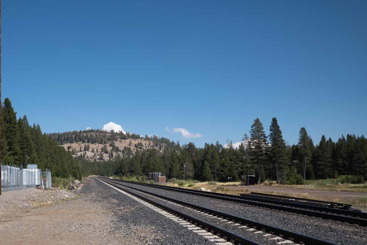In 1993 the Union Pacific abandoned the six mile section at the top of Donner Pass in favor of a newer three mile tunnel through adjacent Mt. Judah that carries the rails under the worst of the summit conditions. The photo below looks west, shortly after the rails emerge from the Mt. Judah tunnel: