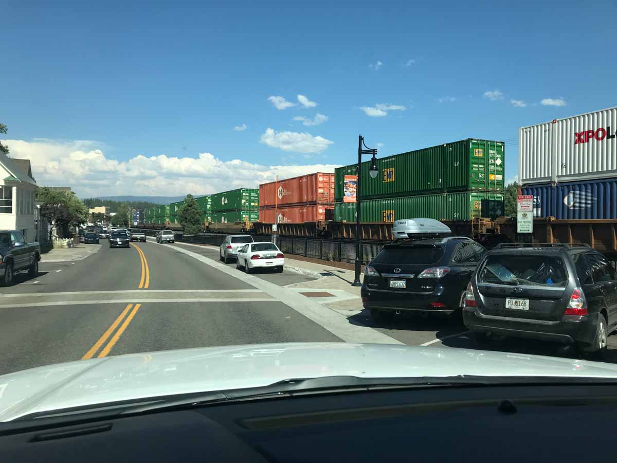 A shaft of sunlight streams in through an opening in the wall. The people in the image give a sense of scale. Look at the size of the concrete columns that reinforce the roof. That is necessary in areas that may be hit with avalanches. Why the height, you ask? In olden days the tunnels needed to be tall to hold and diffuse the steam locomotive smoke. Today they need height to accommodate double stack containers, such as these cars headed west through Truckee: