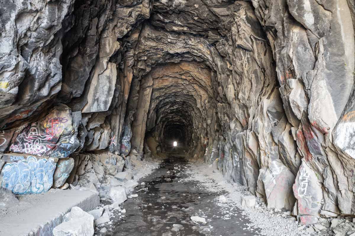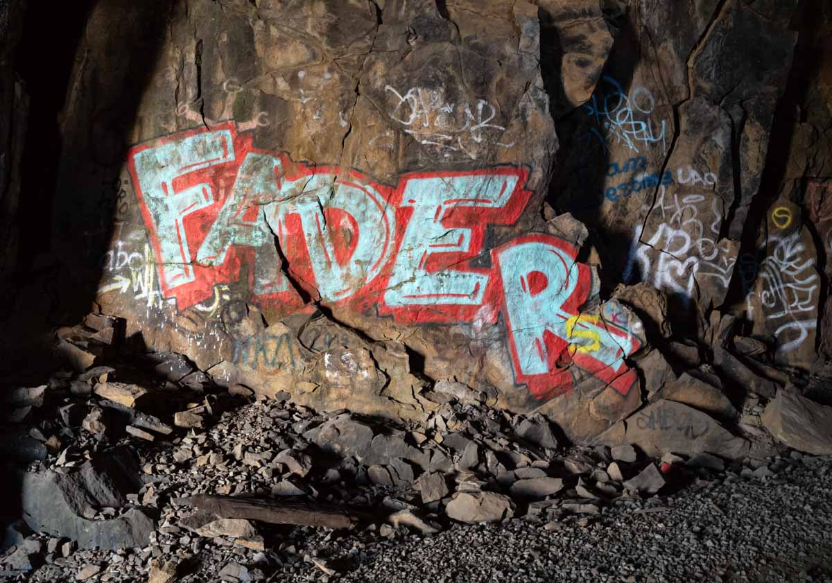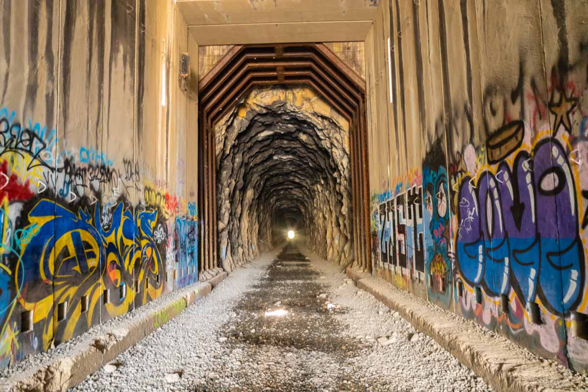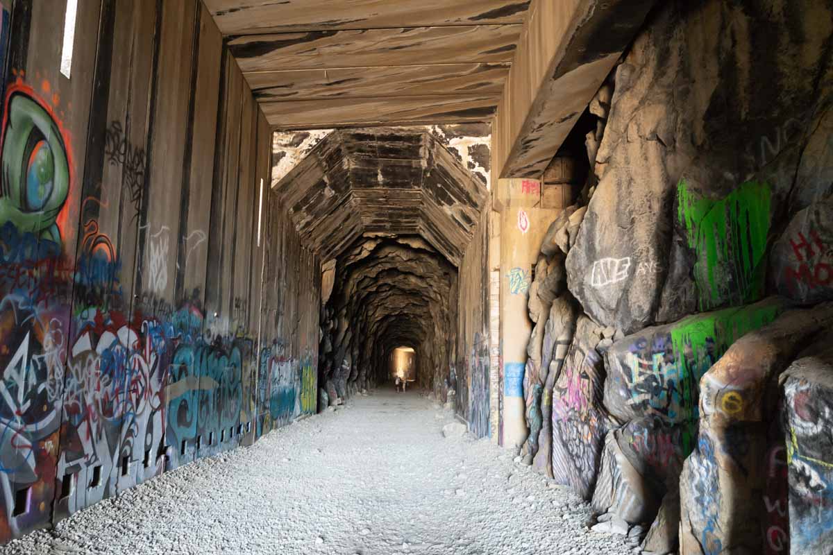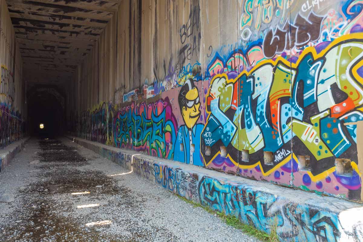 Since then the abandoned tunnels have become a destination for hikers. They are also a destination for urban artists, few of whom braved the threats of trains and railroad police before the tracks were taken up. The tunnels today have an eerie feel, even looking in from outside.