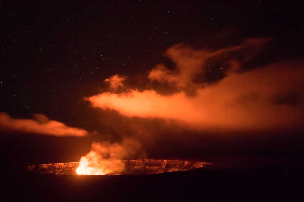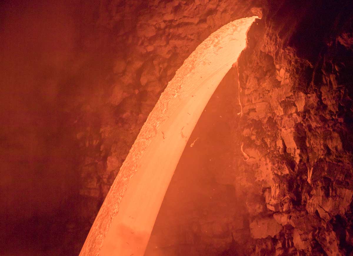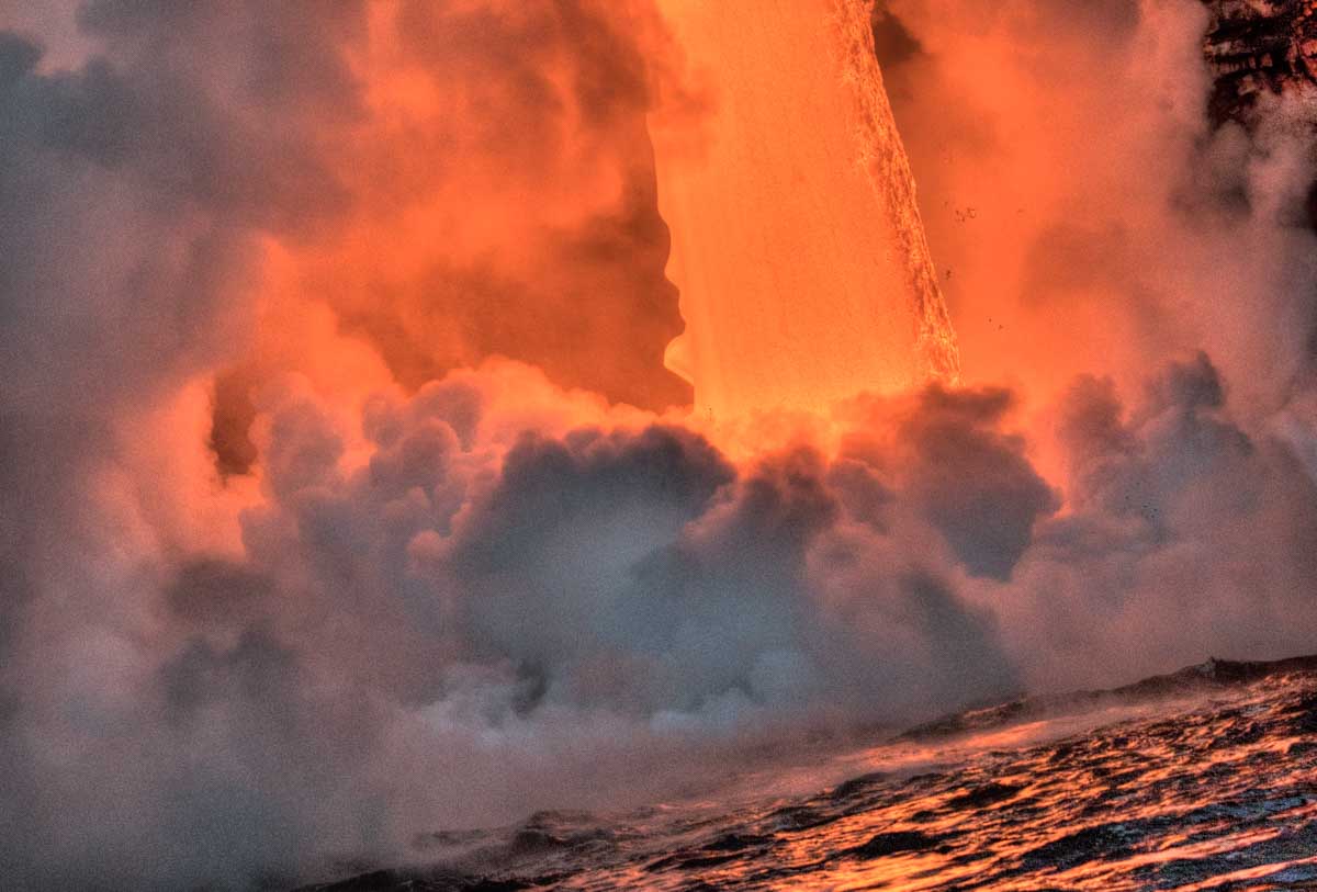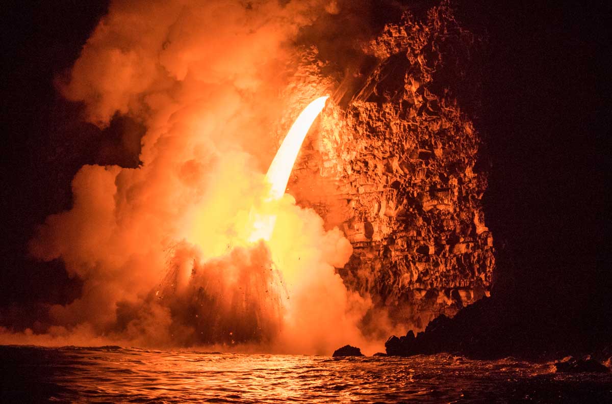 The whole scene was lit by the flickering fiery strand of lava. Sometimes it glowed like the filament of a clear lightbulb. At other moments it was shrouded in a glowing mist of steam. There was a constant roar punctuated by the pops of steam and lava explosions. The lava was some 2,000 degrees when it hit the water, which was over 100 feet deep even right next to shore.