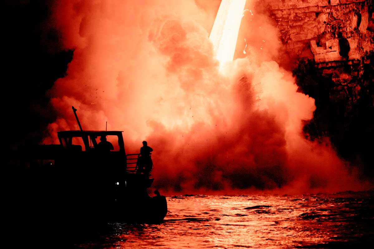 The Times story made such an impression on me that I resolved to go there and see it for myself. I packed a Nikon D5 camera with an 80-400 lens, and set off on the journey. There are three ways to see Hawaiian lava as it flows into the ocean. You can take a helicopter, which gives an aerial perspective and allows access to remote sites. You can hike to the lava, but this flow was emerging from a newly formed and unstable cliff, and could not be approached closely on foot. The final option is to take a boat.