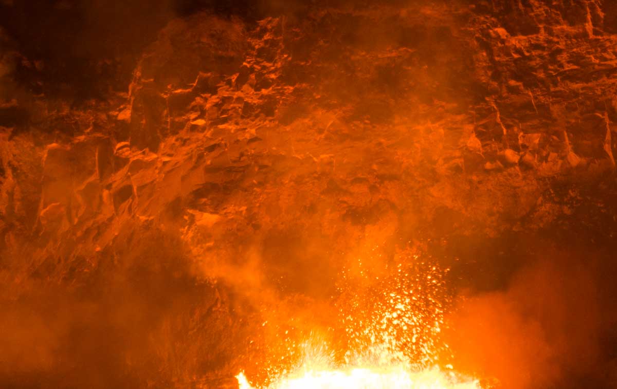 To shoot the pictures below I used manual mode after spot metering for the glowing lava. Shutter speed was set at 1/500 to give sharp images from a moving boat, and I used image stabilization in active mode. By exposing for the lava most of the scene looked black on the raw images but with a high-performance camera you can push the background 4 stops in developing. That’s usually your best bet. If you go brighter and expose for the overall scene the lava will be burned out and there is nothing to be done for that overexposure.