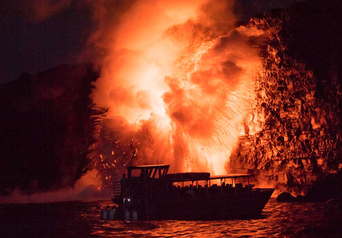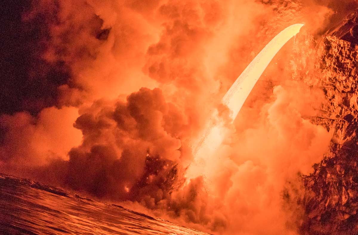 61G lava flow entering ocean at Kamokuna (c) John Elder RobisonThat spectacular but ordinary process became extraordinary when a big chunk of newly created cliff face collapsed into the ocean. On New years Eve the cliff fall exposed a lava tube that led seven miles from Puʻu ʻŌʻō, and it began streaming red-hot liquid rock as if from a fire hose. Video in the Times showed lava arcing downward sixty-some feet into the ocean below, where it exploded in spectacular fashion.The Times story made such an impression on me that I resolved to go there and see it for myself. I packed a Nikon D5 camera with an 80-400 lens, and set off on the journey. There are three ways to see Hawaiian lava as it flows into the ocean. You can take a helicopter, which gives an aerial perspective and allows access to remote sites. You can hike to the lava, but this flow was emerging from a newly formed and unstable cliff, and could not be approached closely on foot. The final option is to take a boat.