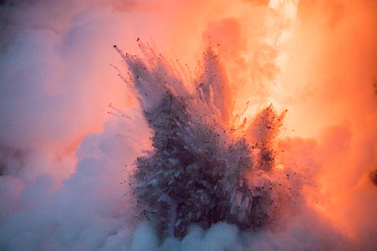 There were explosions every few seconds as chunks of the lava reacted violently with the seawater. I successfully captured several blasts on camera. You can do that in single shot mode if you are fast (I have a lot of practice catching those moments in performance photography) or you can use a continuous shutter at the expense of a great many wasted shots.
