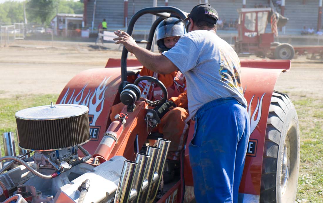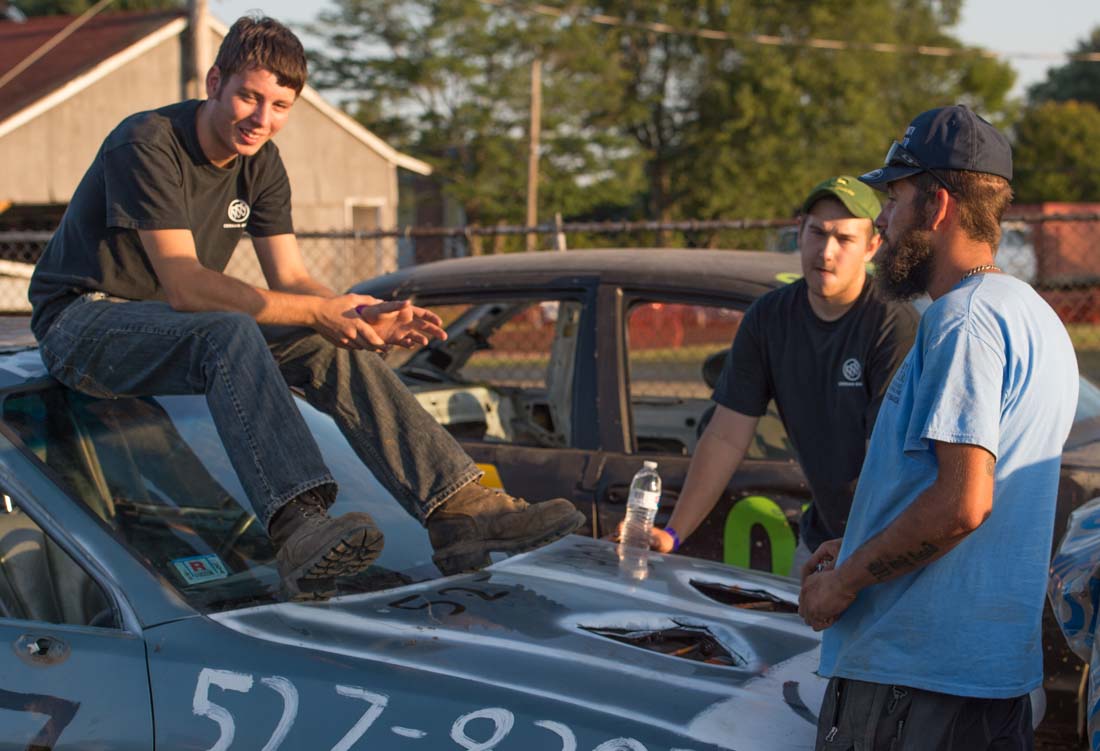 Finally the day comes for the Derby - the affair that will settle everything. Trucks converge on the fairgrounds with a fleet of cars, and the drivers and their supporters trickle in through the afternoon. The get read backstage as the field is readied by dragster tractor pulls and clowns.