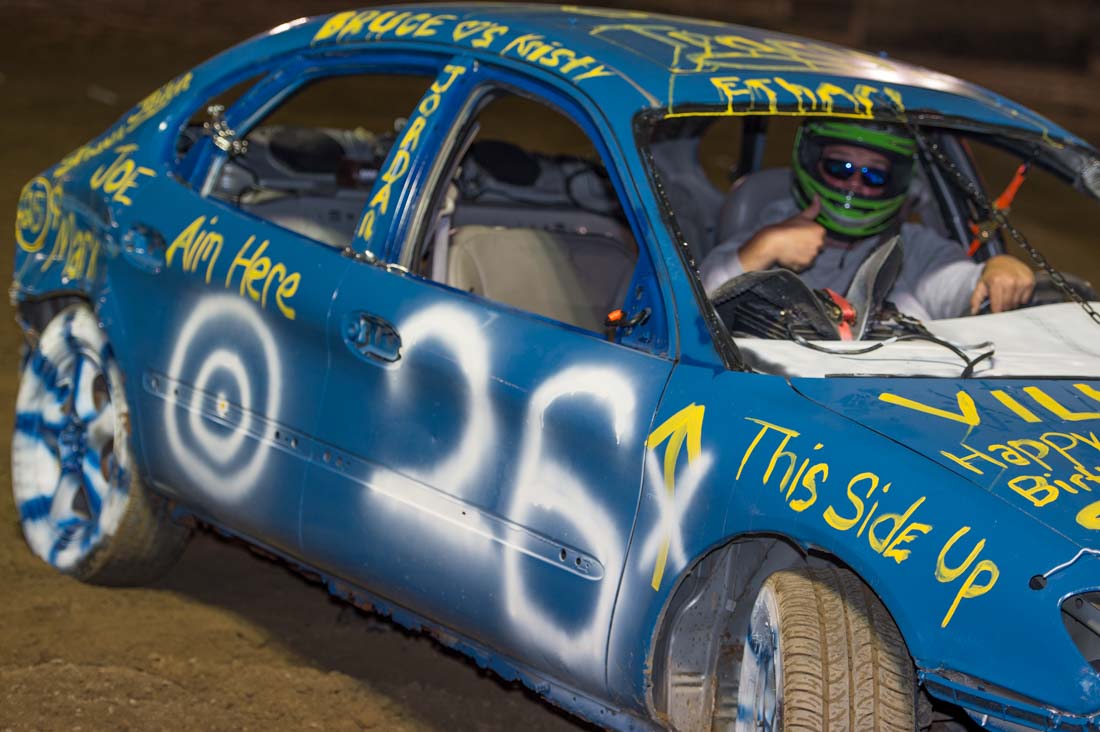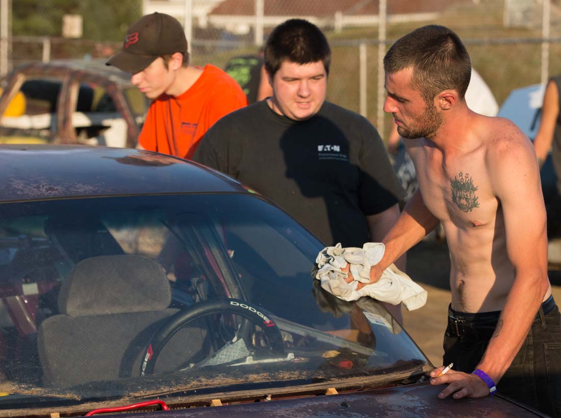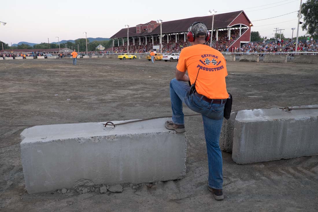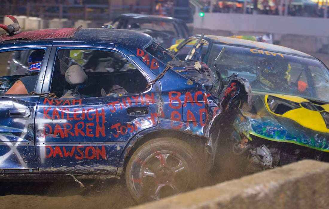 Families put their kids out front, like bait for the drivers, where they shake their little arms and yell. By the end of the night the lucky ones are spattered with dirt from the field mixed with antifreeze and transmission fluid – the blood of beasts sacrificed on the field. All of them have a story to tell, and a few have souvenirs – pieces of car that fly into the seats when car hits the concrete barriers with particular emphasis.