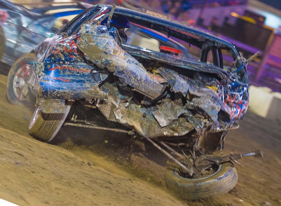 The spectacle starts with little cars and ends with the big bruiser V8s - Deathmobiles like the one made famous in the movie Animal House. When it's all over the survivors stand atop their cars as trucks haul away the bits of wreckage.