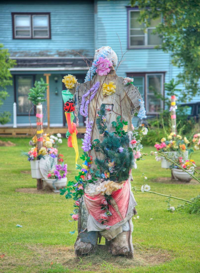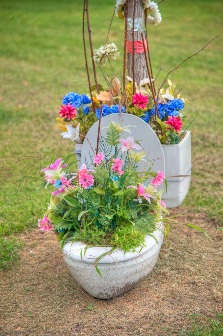 Then there is whimsy. A block up from the court, the Patron Saint of the Bathroom stands before his legions.