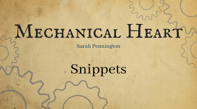 Hey'a, everyone! Thanksgiving break was awesome, but coming back kind of hit me like a punch to the face (especially since I had several projects that I intended to work on but didn't . . . oops). And the blog tour that I was going to participate in is currently experiencing technical difficulties. So, I'm going with something easy for this week's post: Mechanical Heart snippets. Enjoy!