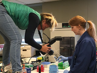Annie (L) at work on Zoo Scientists to the Rescue in Dr. Rachel Santymire’s (R) lab