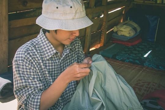 Quạ chở mình trên chiếc xe máy, chạy hơn 20km về phía ngoại ô. Tụi mình băng qua một quãng đường đất đá lởm chởm, dốc và quanh co, đến ngôi nhà trong rừng nơi Mát đang tá túc, gửi xe máy rồi đi bộ lại quãng rừng thông để tìm em. Anh chị chủ bảo rằng em đang ở đâu đó trong rừng. Mất một lúc, tụi mình tìm thấy em đang ngồi dưới gốc thông, vừa thêu vừa hát. Mát đón tụi mình bằng nụ cười rất tươi, và em bắt đầu kể về quãng thời gian ở Đà Lạt, cuộc sống của em mỗi ngày, những thay đổi và những cảm nhận bên trong em. Em liếng thoắng không ngừng, mình và Quạ chỉ nghe rồi mỉm cười. “Dạo này em không nói chuyện mấy, hình như em để dành tất cả lại để nói cho chị với Quạ nghe!” Mát nói, tay vẫn không ngừng thêu những bông hoa nhỏ xinh lên chiếc áo cũ. Những ngày đó, đi đâu em cũng cầm theo chiếc túi thêu chứa những cuộn chỉ đầy màu sắc.