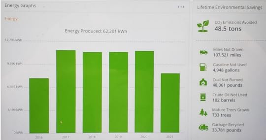 But I do care about another kind of savings. A figure popped up on my monitoring website when I checked the other day: our small system had already saved our atmosphere from 48.5 tons of carbon dioxide (CO2)! Quite a surprise to me since I had not been following it closely. A fine achievement, I thought, and a benefit of our moving to this sunny state from the East Coast. Alternatively, as can be seen below, the benefit can be translated into other great things for healing our planet from human abuse.