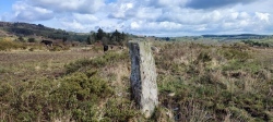 An Ogham stone in the townland of Crushterra, Co. Cork. There is a faint inscription on the SSE edge of the stone reading AFG/M(?)OLA. In rough grazing on a north facing slope. An upright rectangular stone (H 1.55m; 0.47m x 0.37m) with some packing stones exposed at the base; long axis NE-SW.
