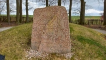 The runestone of Tullstorp stands in the churchyard in the village of the same name (belonging to Trelleborgs kommun), about 20 km east of Trelleborg in southern Scania in Sweden. It dates from around 960 to 980AD/CE, when the Viking king Harald Bluetooth tried to Christianize the Danes. During this period, it was common to place runestones near a church. Most of them were later built into the churches, like this one, built in the middle of the 12th century. In 1846 the medieval church was demolished and the stone in the eastern wall was found. A transliteration of the runes follows: