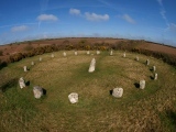 Stone Circle in Cornwall more properly known as Boscawen-Ûn. The focus of fascination with this evocative circle is certainly the pillar located in the centre. Although it is a full 2.5m (8 feet) in length, it leans at such an angle that its tip is only 1.9m (6 feet 2 inches) above the ground. Excavation has revealed evidence that it was installed in the leaning position.