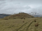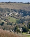 Purported to be a lost hill figure connected to the local Roman villa and mosaic. Identified by Graham Thomas as an ice age glacial feature. Tbe circle is seen middle and upper of the top photo, taken from the west facing east. It has thinned and the top is now largely missing. The text below is by Jo-Anne Wilder, from 3rd Stone Issue 23.