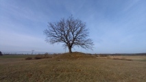 This burial mound on which an oak tree stands is located on a hill between meadows and fields in Mecklenburg-Western Pomerania. On top of the mound is a depression in which a few larger stones can be seen, which probably belong to the tomb inside.