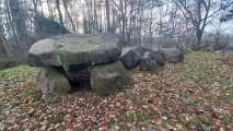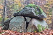 A chambered tomb in a small clearing in the pine forest. Measuring 22m by 8m, including perimeter stones, It has five good captones and 13 excellent uprights. On Teufelsheide Street south west of the town of Osnabrück.