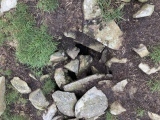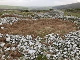 Cruise E Cairn is located on the N end of an elongated natural knoll c. 0.80 miles SSE of New Luce in Dumfries and Galloway. It measures around 16.5m (54 feet) in diameter and 1.5m (5 feet) high. The surface of the cairnn is studded with small stones. Top photo: A cavity around 3 metres west of the centre of the cairn.