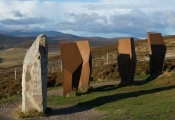 A modern monolith in Moray. The site was enlarged in 2016 when four Corten steel standing stone seats were added as part of the SnowRoads Scenic Route Project. The original stone has an inscription on all four sides reading: