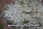 Cup-marks and a Burial Mound on the Island of Bornholm, Denmark. A rock just off the east slope of the Risehøj burial mound with about 20 cup-marks. Some of them are very large, deep and clearly visible.