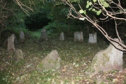 Standing Stones in Bornholm, Denmark. A few meters inside the Troldskoven is a stone ship, which dates from the late Iron Age. Over time, many of the stones have been removed and today there are only a few left.