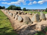 A replica of a long barrow in Schleswig-Holstein, Fehmarn. Inspired by an 1836 drawing of Pastor Diederich Harries, it was set up in 2010. There were long barrows in this area, but there are none remaining. The 60 x 7m barrow was built in an almost exact east-west orientation. Inside of the long rows of kerbstones are two extended dolmens, both set at the ends.