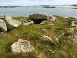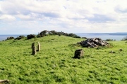 An oval shaped cairn built out from the side of Samson Hill on Bryher, Isles of Scilly. Incorporating three natural rocks it is revetted with large orthostats. The chamber is made from slabs set on edge with additional walling.