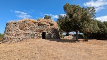 A mixed-type nuraghe, with elements of the corridor-nuraghe and classic tholos nuraghe styles. With interior stairs that allow access to two upper levels. Nearby are two Tomba dei Giganti and an unusual stone row. More details from our page.
