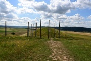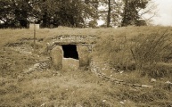 An Iron Age oppidum NE of Frankfurt consisting of a fortified settlement and several burial mounds. This chieftain's tomb dating to about 500 BCE was excavated in 1990 after aerial photography revealed interesting patterns. The posts in the excavated post-holes were reconstructed in 2007. Among other items, a life size limestone statue of a warrior with an unusual helmet was found that we featured a few days ago. The mound is surrounded by ditches which may have been processional paths. The statues were found buried in the ditch. These ditches lead to comparisons with Tara in Ireland.