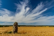 A standing stone approximately 2.1m (7ft) tall composed of conglomerate sandstone with lots of small rounded stones embedded in the rock. This stone is supposedly the last remnant of a Clava Cairn. Remember it is in a farmer's field but it is easy to photograph from the edge of the field if the field is in crop.