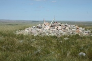 "Canada's Stonehenge". Iniskim Umaapi medicine wheel site one of the oldest religious monuments in the world.. Medicine Wheel in Vulcan County, Alberta.The central cairn is nine metres in diameter and is surrounded by a stone circle 27 metre across. about 28 spokes link the circle and central cairn. In 1971 an excavation yielded artifacts which were "dated" by stone tool style. This method and radiocarbon dating of bone place initial construction of the central cairn at some 4,500 BP, although another source dates the initial site to 3200 BP. The tool finds indicate a succession of added material over the centuries.