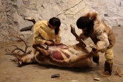 A group of three caves in Yukon Territory which contained stone and bone tools and apparently butchered horse, bison, and caribou. The oldest evidence (widely accepted) dates to around 13,000 years, probably belonging to the palaeoarctic culture. Lower layers of artifacts go back as far as 25,000 years, but with very limited evidence of human presence - difficult to clearly interpret and obviously controversial. Photo: The Bluefish Caves exhibit at the Yukon Beringia Interpretive Centre in Whitehorse.