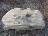 A new discovery revealed by recent heather burning, a good candidate for a cup marked rock, what do you think?. A semi circular shaped rough gritstone rock projecting from the ground, natural weathering striations on the curved upper surface which also has four cup shaped depressions clustered together in a triangle formation.