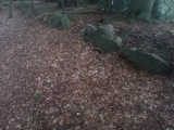 Circular rampart (German: Ringwall) of 140m in diameter. The stones seen in the top photo were probably added to the ramparts from destroyed megalithic tombs from the forest in the 20th century.