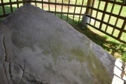 In a valley distant from human residences in Kyūshū, Japan, there are three big flat stones with engravings representing bows, arrows, ships and so on. Two of them are preserved under shelters and the rest were buried back into the soil. They are hard to see in the photo but there is a diagram interpreting the carvings on our page.