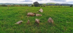 Sometimes listed as a stone circle but in fact a radial-stone cairn. These are classified as a mound constructed primarily of stone which is delimited by a series of spaced stones set with their long axes aligned towards the centre of the cairn. Their precise function is unknown though through association with stone circles and stone rows they belong to the wider ritual tradition of the middle/late Bronze Age (c. 2400-500 BC).