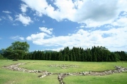 Jōmon era stone circles in Japan might be roughly classified into 2 types (different opinions exist) : ring-shaped type and sundial-shaped type. Both types distribute in Hokkaidō island and Tōhoku region which are now separated by Tsugaru Strait. At Ōyu site in Akita prefecture, both types co-exist.